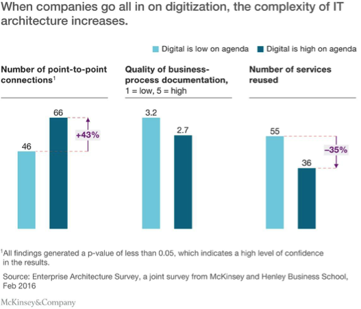 In August 2016, McKinsey & Company found that when companies actively pursue digital transformations, the complexity of their technology operations can increase significantly.