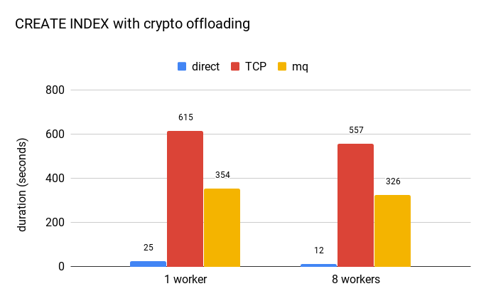 The blue bar represents an index created directly on the bytea value, representing the encrypted value. It’s clear the overhead is significant, creating the index is at least an order of magnitude slower (with TCP being twice slower than mq message queues). Furthermore, the custom data type can’t use sorting optimizations like abbreviated keys etc. (unlike the plain bytea type).