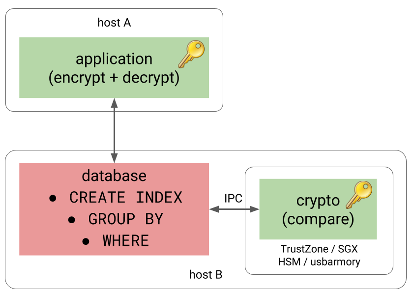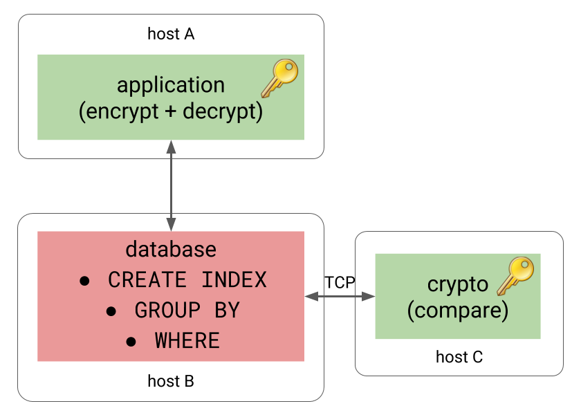 This way the database still does not know anything sensitive, yet it can meaningfully perform indexing, aggregation and similar tasks. And while there’s another component with the knowledge of encryption keys, it may be much simpler and smaller compared to the whole RDMBS, with much smaller attack surface.