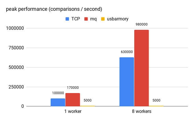 On this particular system (with Xeon E5-2620 v4 CPU, the TCP-based version handles up to 100k operations per second, and the MQ-based one handles about 170k. With 8 workers (matching the CREATE INDEX test) it can achieve about 630k / 1M ops.