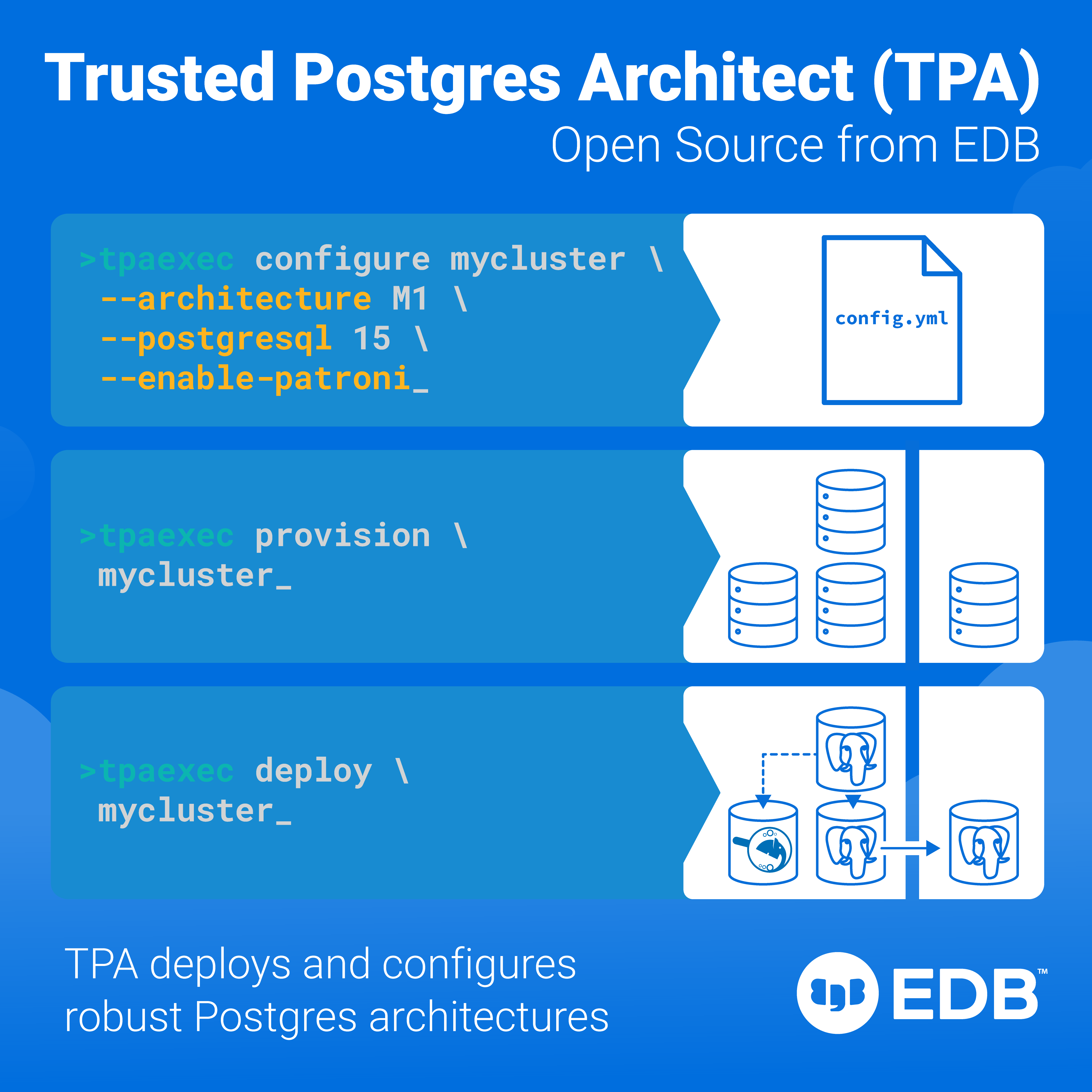 Trusted Postgres Architect (TPA) embodies the best practices followed by EDB, informed by years of hard-earned experience with deploying and supporting Postgres as well as a host of HA tools. Trusted Postgres Architect (TPA) is a proven tool that developers, application architects, and DevOps personnel responsible for deploying databases (DBA) can benefit from.