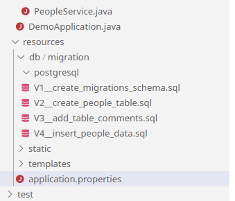 At this point, you have configured the application to disable the Hibernate schema management, and you have specified the location for the schema migrations; which is under “resources” directory, under “db/migrations”—see the screenshot for the migrations folder and the names above.