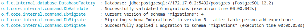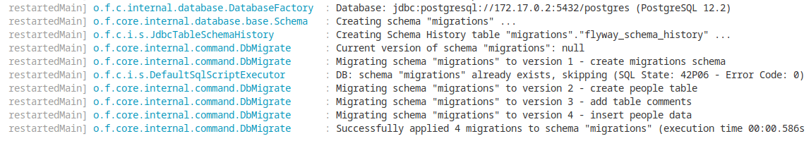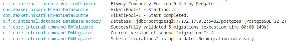 Interesting bit is, if you run the application which does not contain any new migrations, Flyway will not make any changes to your PostgreSQL database; it is a constant time operation that checks your PostgreSQL database for latest migration, and compares it with the migrations in app resources. Rerunning the application shows this log: