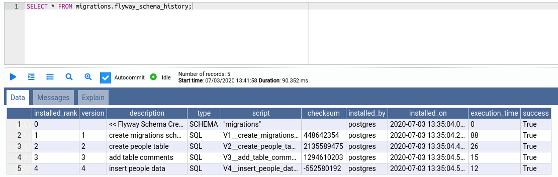 You can note that schema migrations are just SQL scripts that are executed on the PostgreSQL database; as shown in the 5th record, where I am inserting the records in the PostgreSQL database. Flyway tool, or PostgreSQL database has no bias to DDL and DML when it comes to schema migrations.