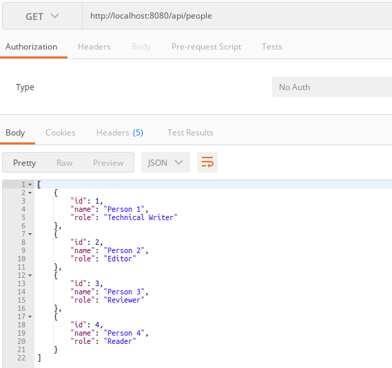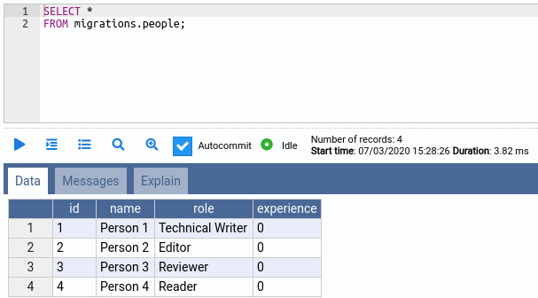 Lastly, we insert some records in the PostgreSQL database for the people table: