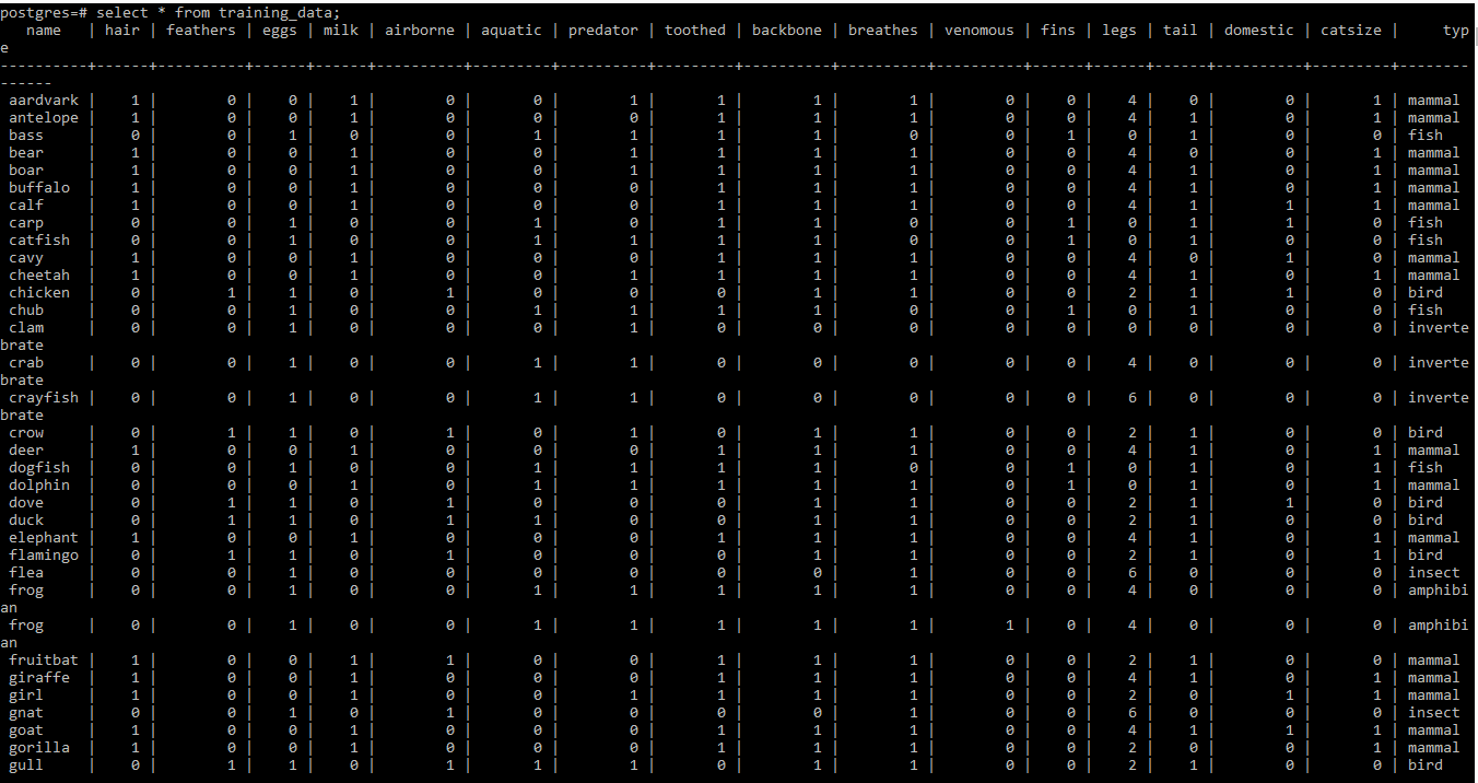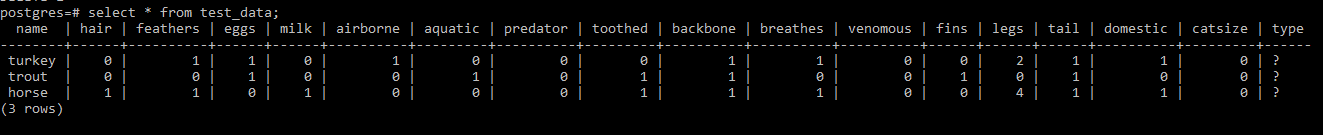 CREATE TABLE test_data(name VARCHAR (100), hair integer, feathers integer, eggs integer, milk integer, airborne integer, aquatic integer, predator integer, toothed integer, backbone integer, breathes integer, venomous integer, fins integer, legs integer, tail integer, domestic integer, catsize integer, type VARCHAR (100));