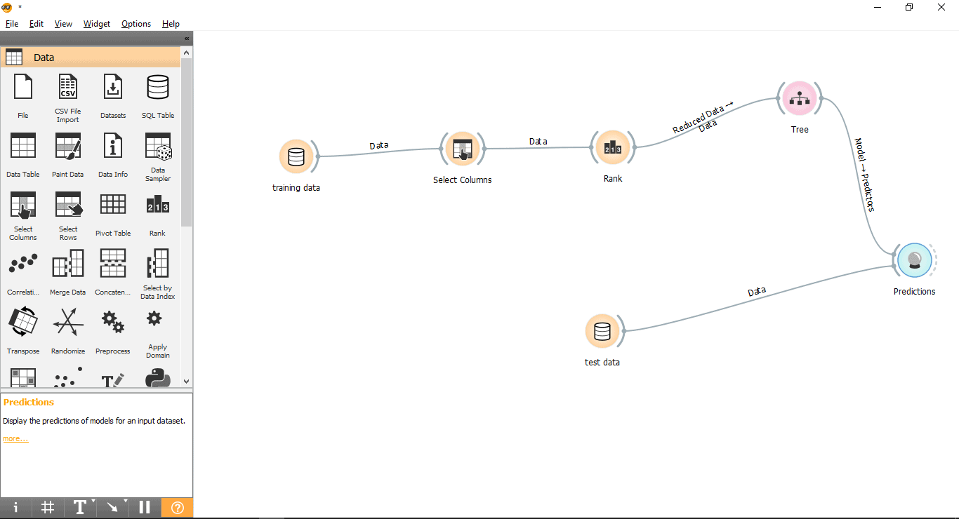 For this article, Tree model is used to train the data. Once the data training process is complete, in the next step, test data is passed to the Prediction widget to check the accuracy of predictions.