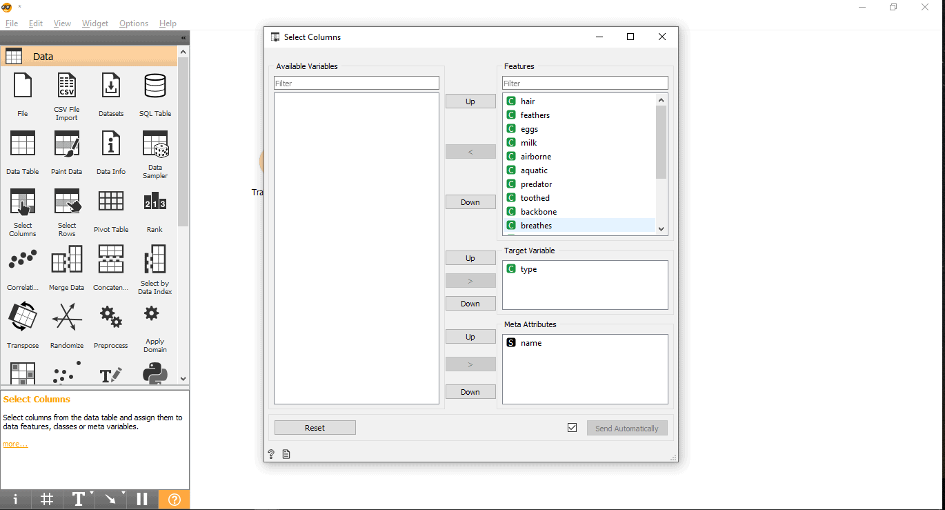 - Search your target column under the Features label. Here, the type is used as a target variable because we need to see what type a given animal is.