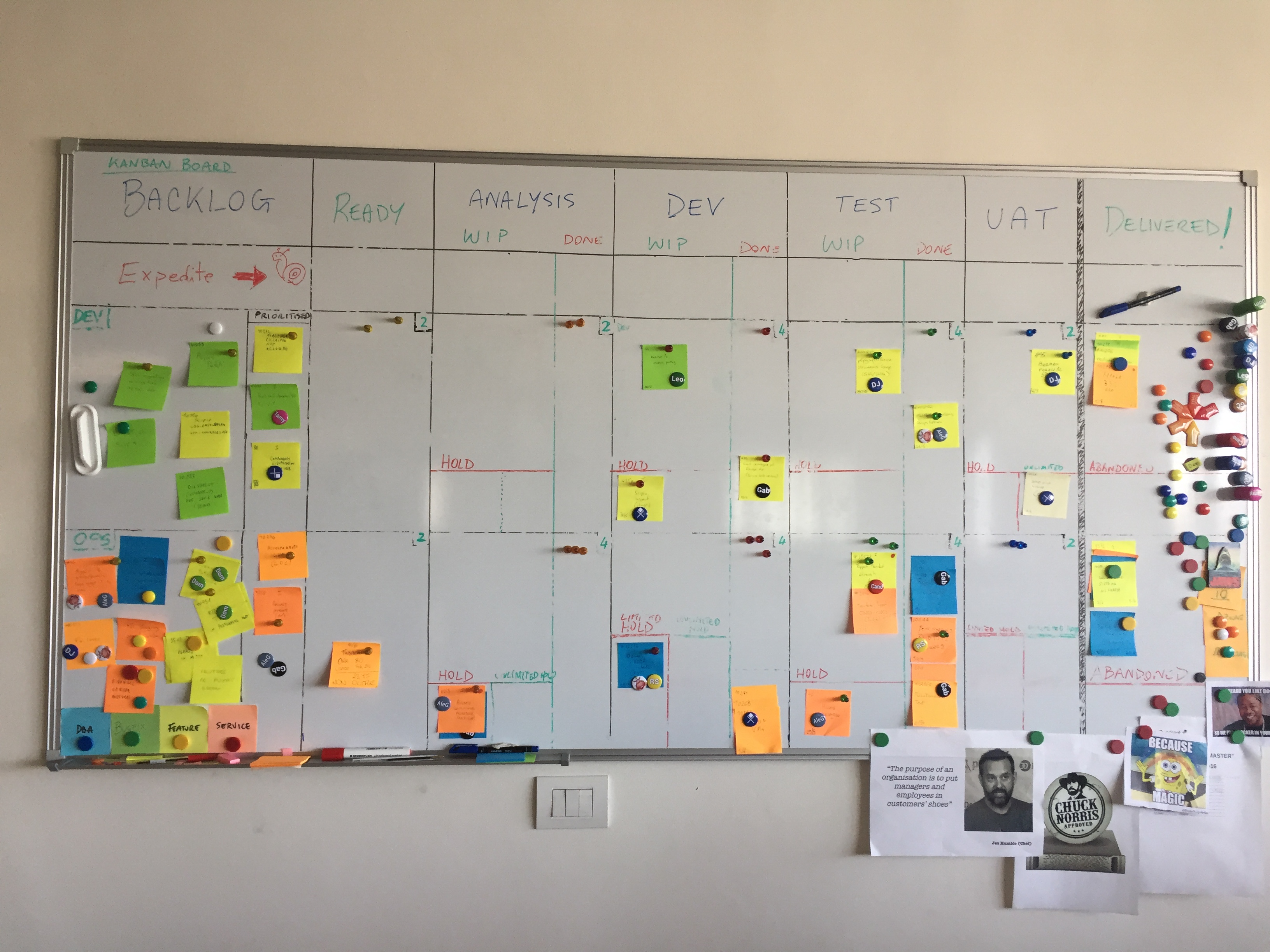 So, let me give you an example: if Marco ended the analysis phase of a feature and put the post-it into “Analysis-Done”, the ticket is waiting for the first free developer. Let’s suppose Giulio completes his current activity and decides, once the priorities have been evaluated, to work on that activity from Marco: he will then take the post-it and move it to “Dev-WIP” and begin working on the task.