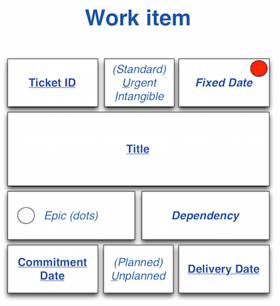 Those who work as knowledge workers know very well how difficult it is to make visible what, by its very nature, is not. For example, developing a feature for a software, installing a PostgreSQL database, running a backup or recovery operation, verifying that the standby server has not accumulated too much delay, and so on. For Kanban, each activity is represented by a post-it, located on the board. The image below shows how we label our work item post-its. Ticket ID is an identifier that corresponds to an issue in Redmine, a great open source tool for collaborative development (which uses PostgreSQL as backend).