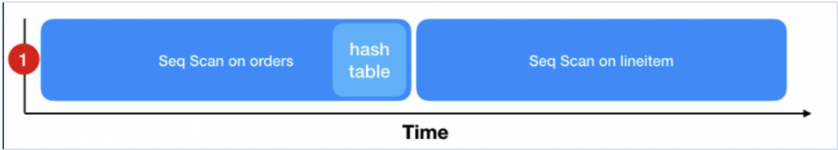For illustration purposes I'm ignoring other costs relating to hash table access, and showing a first order approximation of the execution time. The blue boxes represent time spent executing the inner plan and then the outer plan, which in this case happen to be sequential scans (they could just as easily be further joins). First the hash table is built by executing the inner plan and loading the resulting tuples into the hash table, and then the hash table is probed by executing the outer plan and using each tuple to probe the hash table. So, let's say that the total execution time is approximately inner plan time + outer plan time.
