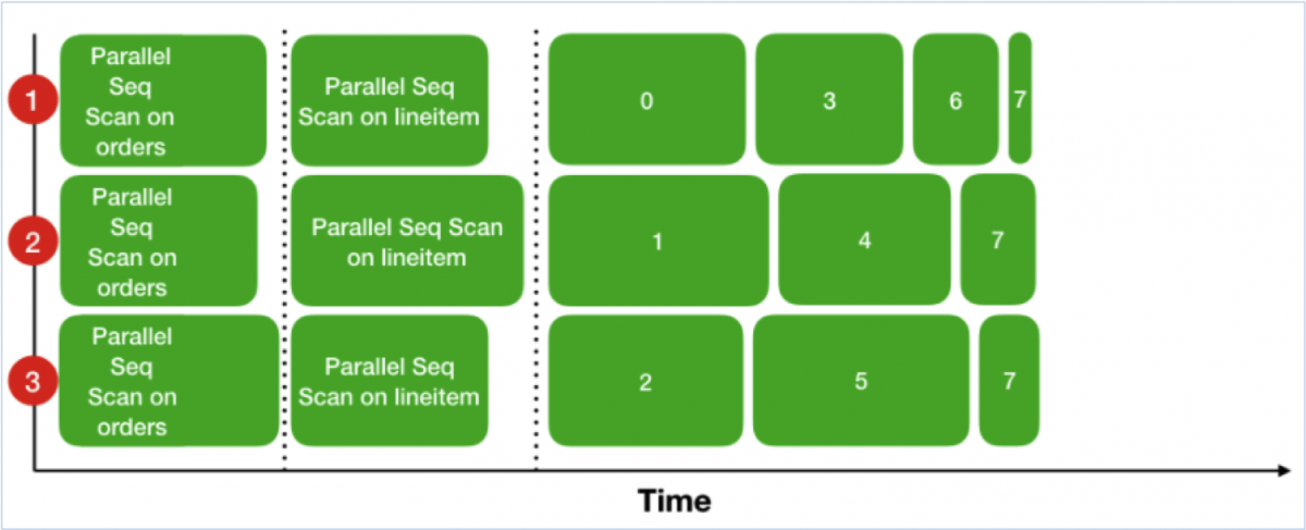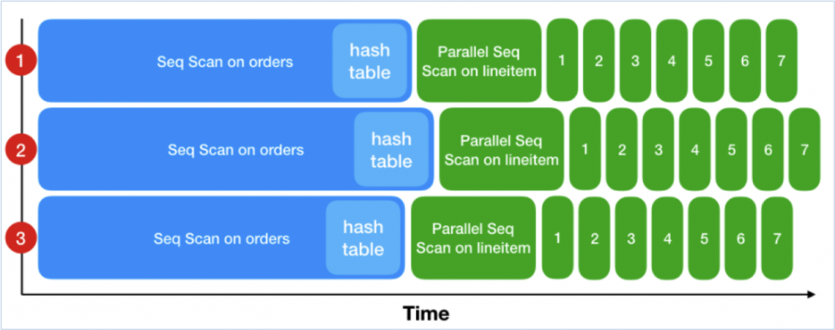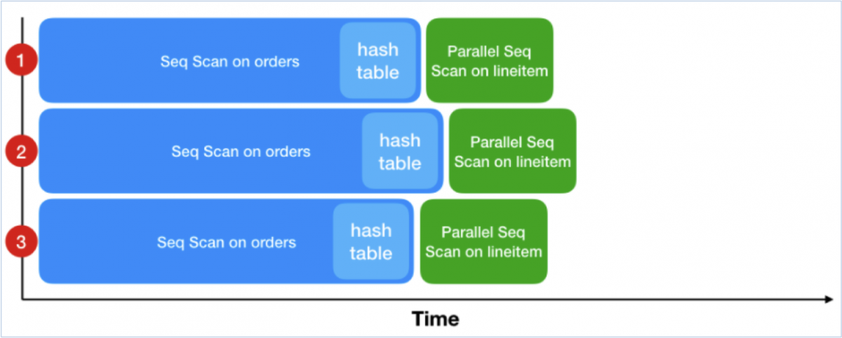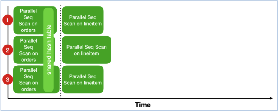 Note the dotted line that appears between the processing of the inner plan and the outer plan. That represents a barrier.  Since they are now sharing a single hash table, all processes have to agree that the hash table is complete before it's safe for anyone to begin probing it. Note also that I show the workers completing the scan at slightly different times (exaggerated for illustration): this is because participating processes work in chunks sometimes called the 'parallel grain', which in this case come from the 8KB disk blocks into which Parallel Seq Scan chops the scan. When the end of the scan is reached, each process runs out of pages and then waits at the barrier. The waiting time is bounded and typically very short because whenever any process runs out of pages every other processes can only be at most one page away from reaching the end too. (If the parallel grain is increased, say because PostgreSQL switches to larger sequential scan grain, or if something expensive is being done with tuples in between scanning and inserting into the hash table, or if the parallel grain is not block-based but instead Parallel Append running non-partial plans, then the expected wait time might increase.)