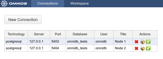 Then click on the Test Connection action on each connection. You will have to type the password of the user omnidb, which is also omnidb.