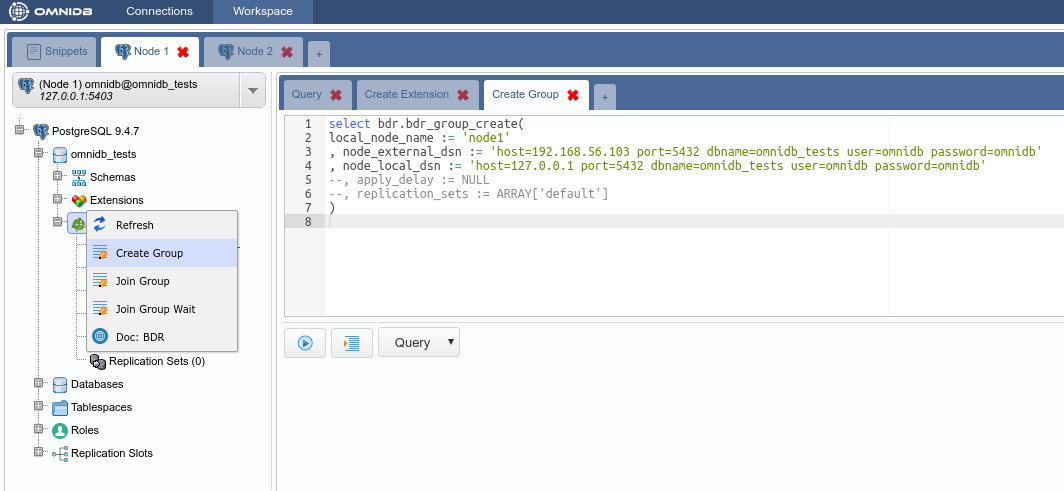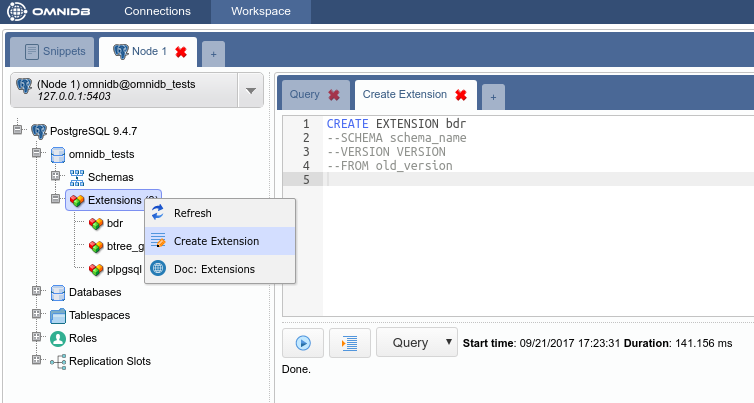 BDR requires 2 extensions to be installed on each database that should have multi-master capabilities: btree_gist and bdr. Inside OmniDB, you can create both extensions by right clicking on the Extensions node, and choosing the action Create Extension. OmniDB will open a SQL template tab with the CREATE EXTENSION command ready for you to make some adjustments and run: