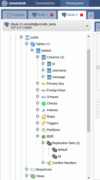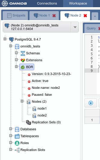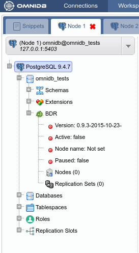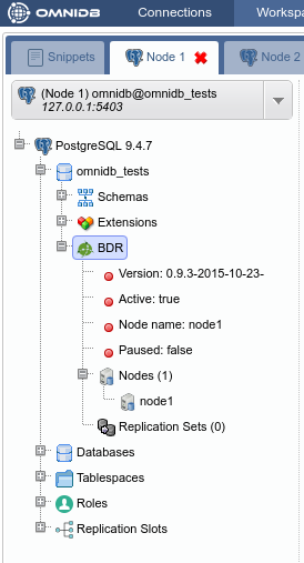With both extensions installed, you can refresh the root node of the OmniDB tree view. A new BDR node will appear just inside your database. You can expand this node to see some information about BDR: