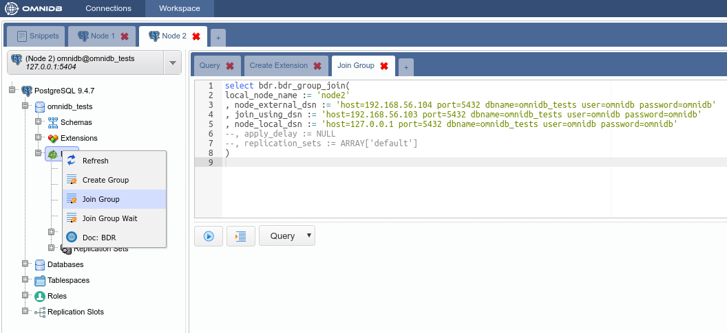 To create a BDR group, right click in the BDR node. In the SQL template, adjust the node name and the node external connection info (the way other nodes will use to connect to this node):