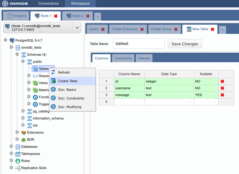 Let’s create a table in the first node. Expand the public schema, right click the Tables node and choose Create Table. Give the new table a name and add some columns. When done, click in the button Save Changes: