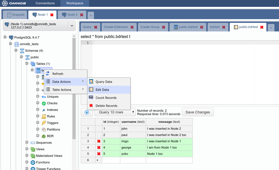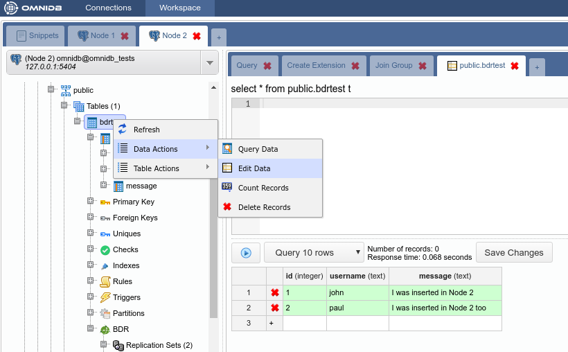 While you are at the second node, right click the table bdrtest, point to Data Actions and then click in Edit Data. Add some rows to this table. When finished, click in the Save Changes button.