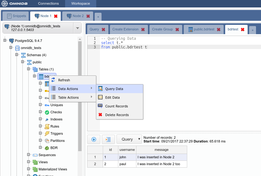 Here we will show how to build a test environment to play with BDR and how to configure it using the OmniDB 2.1 web interface.