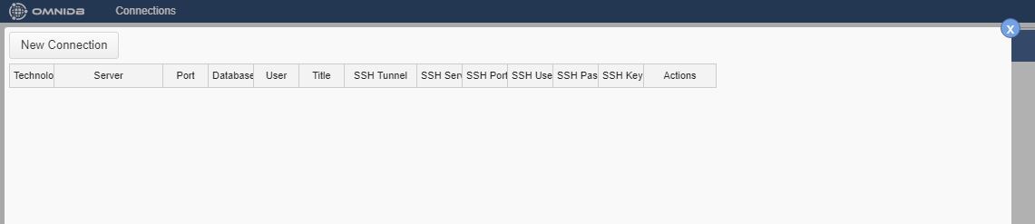 OmniDB allows users to manage multiple databases (PostgreSQL, Oracle, MySQL, MariaDB, etc) in a unified workspace with a user-friendly and fast-performing interface. In order to start managing your PostgreSQL database, you need to first establish a connection with it. Without any connection, your interface should look like the following: