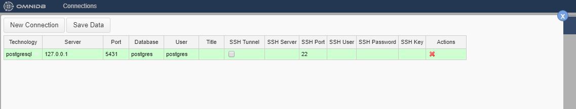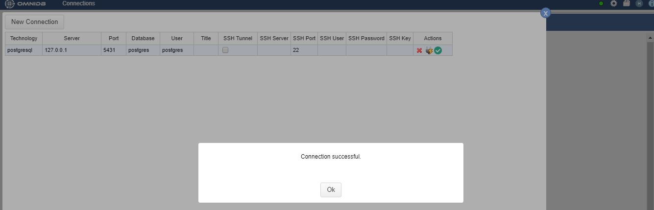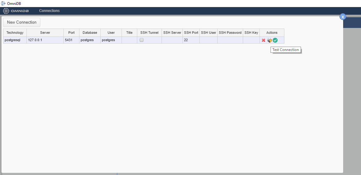 To start using your connection you will need to open OmniDB workspace screen. This can be done by selecting the connection you just created and tested.