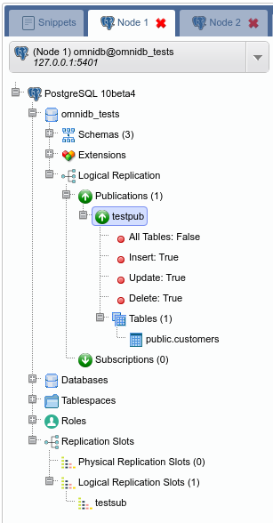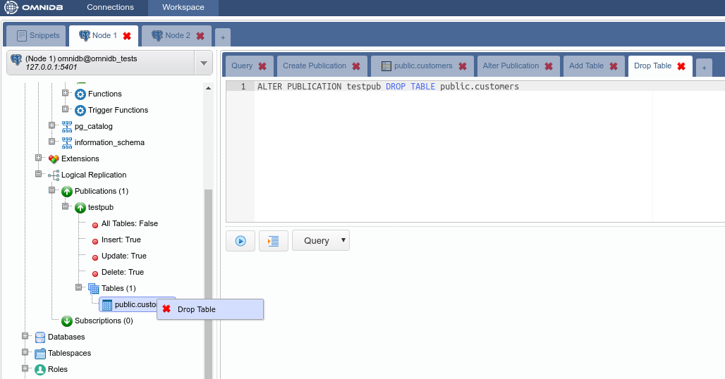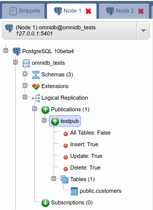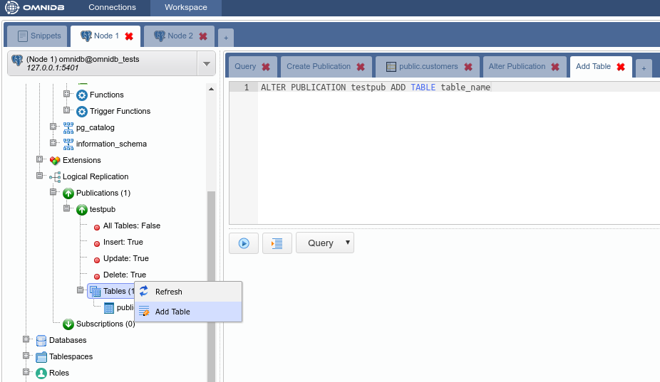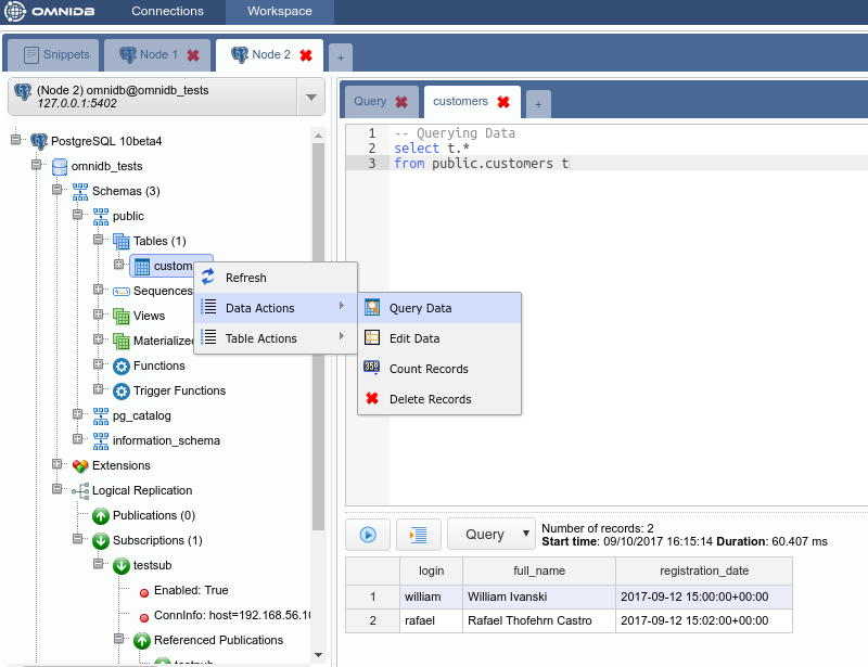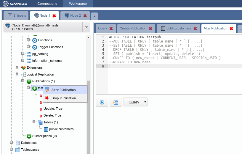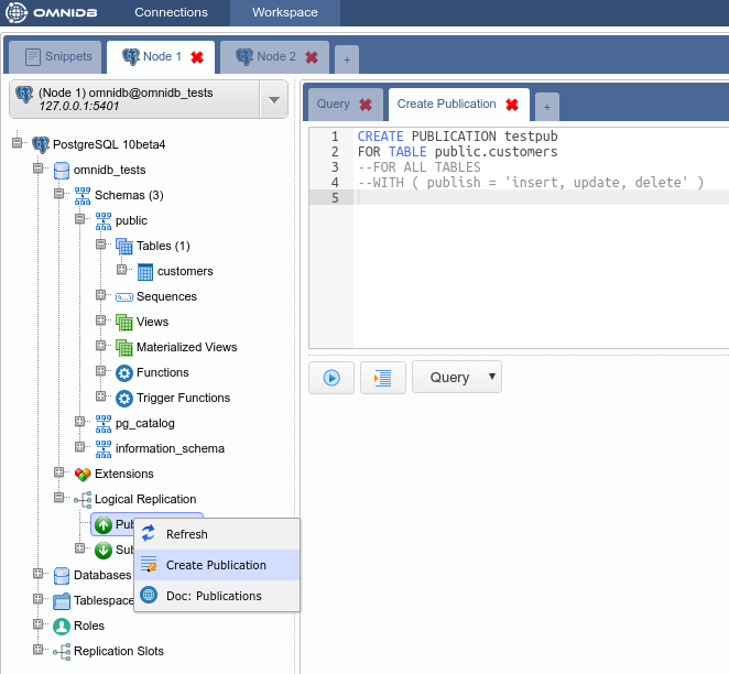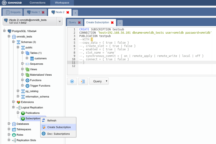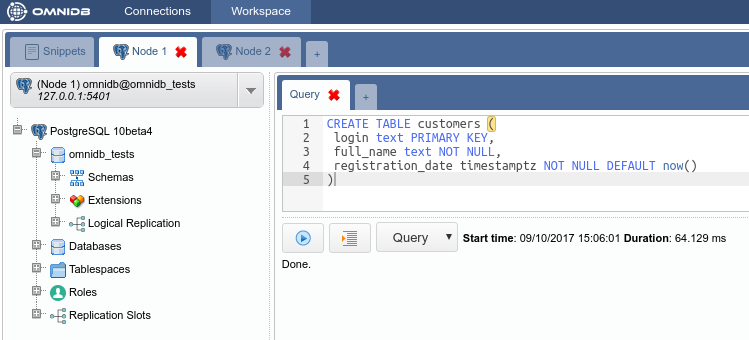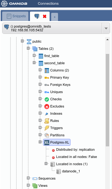You will see OmniDB workspace window. Expand the tree root node. Note that OmniDB identifies it is connected to a Postgres-XL cluster and shows a specific node calledPostgres-XL just inside the tree root node. Expand this node to see all the nodes we have in our cluster: