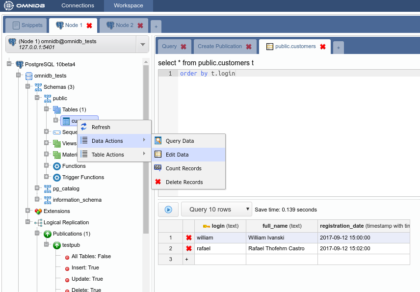 Then click on the Test Connection action. You will have to type the password of the user postgres, which we set above as omnidb. After that you can click on the Select Connection action.