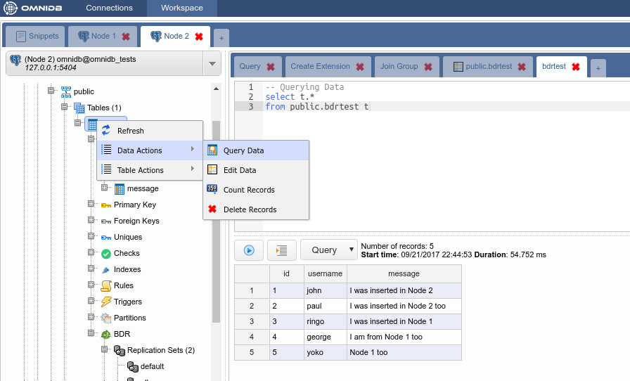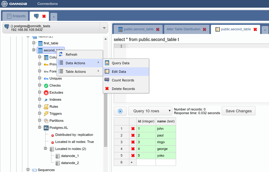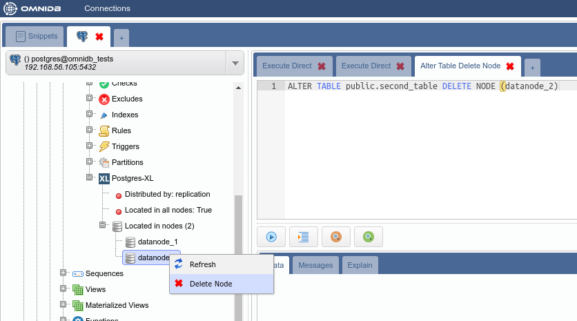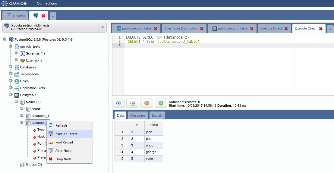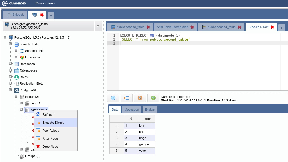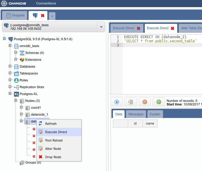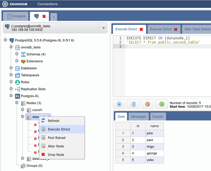 But how the data was distributed in the data nodes? In the Postgres-XL main node, right click on each node and click on Execute Direct. Adjust the query that will be executed directly into the data node, as you can see below.
