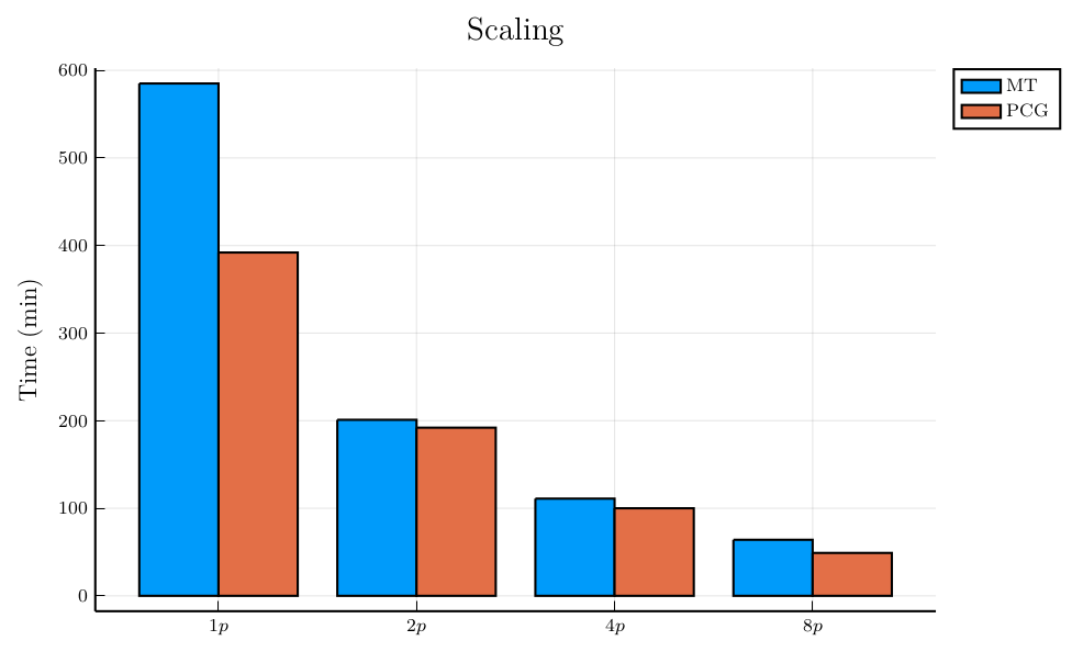 Based on these results, it seems that the time spent in the random number generator code is pretty small compared to the rest of the data generator. Extrapolating from the previous tests, 6 of 392 minutes it took to generate data with 1 process using the PCG generator was in the PCG code, which is less than 2% of the time. But there is a significant savings when using a generator that allows you to advance the generator for significantly improved results in parallelism.