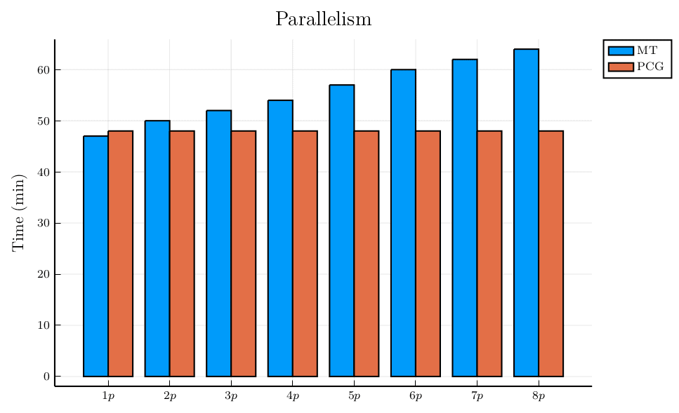 The results from the MT generator were not what I had expected. When generating data with only one process, the results with the MT generator was 50% slower than the PCG generator, but the results became much closer between the MT and PCG generators when the data generation was split into multiple processes.