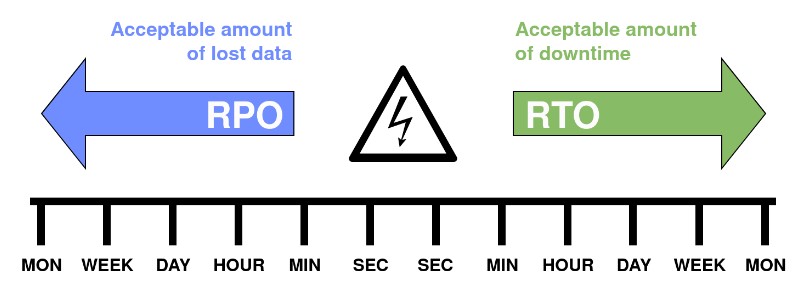 Two of the things we need to define upfront are both the Recovery Point Objective (RPO) and Recovery Time Objective (RTO). There’s a business-driven definition of these terms, but it really comes down to this diagram: