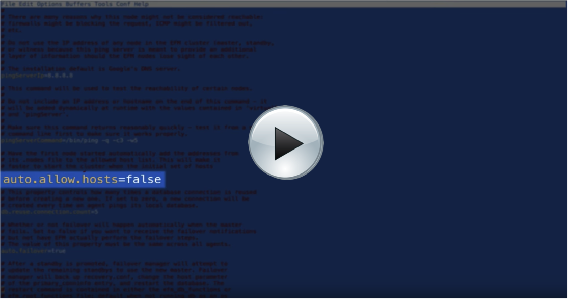 The first video covers installation and setup of EDB Postgres Failover Manager. If you are upgrading from a previous version, the upgrade functionality is demonstrated, which automates moving your configuration settings to the new version. For new users, a walkthrough of all the configuration properties is included as well.