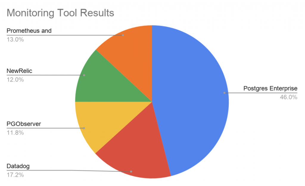 Postgres Enterprise Manager received the highest response, with nearly half of the responders (46%) using it to monitor Postgres instances, followed by Datadog (17.2%), Prometheus and Graphana with Postgres data collector (13%), NewRelic (12%), and PGObserver (11.8%).