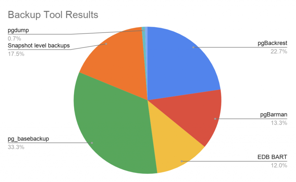 Nearly ⅓ (33.3%) of the 2803 responders said pg_basebackup is their backup tool of choice for their PostgreSQL database, followed by pgBackrest (22.7%), Snapshot level backups (17.5%), pgBarman (13.3%), and EDB Bart (12%). 0.7% of responders selected the “Others - please specify” option and described using pg_dump for backup.