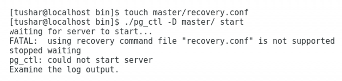 With PostgreSQL v12,  “recovery.conf” is no longer valid. Even if someone were to create a recovery.conf file manually and keep it under the data directory, the server is not going to start and will throw the following error:
