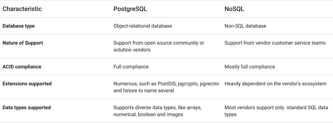 The main difference between PostgreSQL and NoSQL is that the latter handles data storage differently. NoSQL databases typically have flexible schemas that aren’t constrained to rows and columns of a typical relational table, making NoSQL ideal for handling unstructured or semi-structured data.