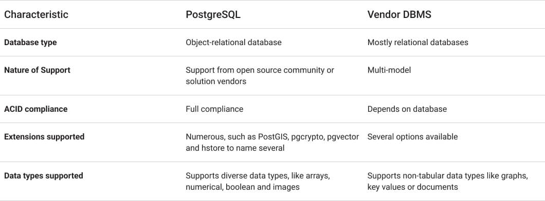Most vendor databases, however, do not offer the same technical flexibility and capabilities of PostgreSQL: