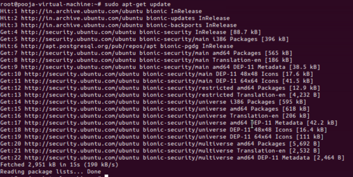 root@pooja-virtual-machine:~# sudo sh -c 'echo "deb http://apt.postgresql.org/pub/repos/apt/ bionic-pgdg main" >> /etc/apt/sources.list.d/pgdg.list'